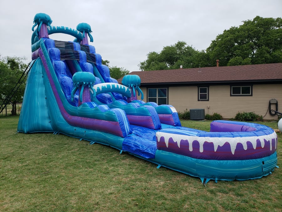 It's like being under the ocean swimming with the jellyfish. Our Electric Jellyfish would be the life of the party with its shear height at nineteen feet, but adding all those ocean like colors and jellyfish seal the deal. Family and friends can get caught in the current while going down the steep slide, past the jellyfish and into the large pool at the end. It's great for all ages who love the water.