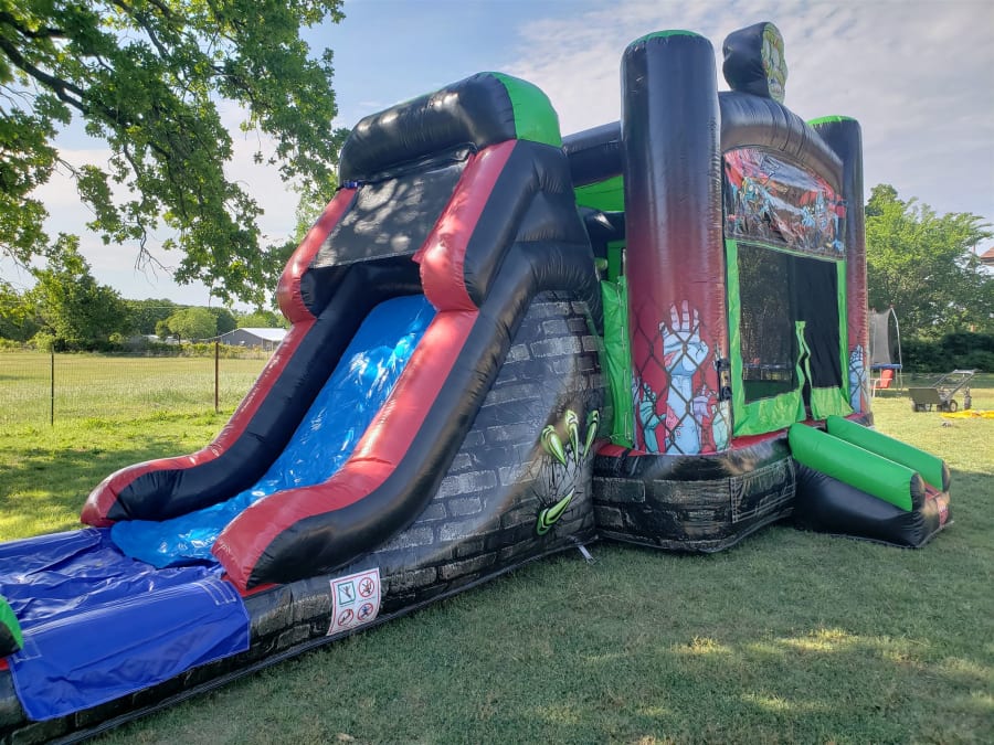 Yikes! The Zombie Apocalypse is upon us. You're okay for fun in the safehouse from the zombie horde. This creepy but fun bounce house combo has basketball goals inside and out for game play. A large bounce house area provides room for several of your friends, and for a quick safe exit just climb up and slide out either wet or dry!