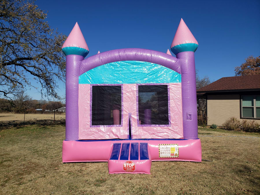 Let your little princess dazzle her friends in our Sparkling Princess Bounce House. Wonderful color tones of pink, purple and blue in sparkle make everything more fun. A large jump area allows everyone plenty of room to play games or jump all day. Several different elements to play with inside; two different pillars, a crawl through and basketball goal for hoops. This bounce house is a great addition to your princess party for a sparkling good time.