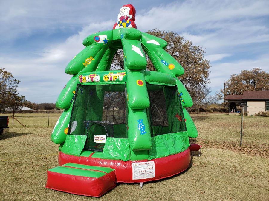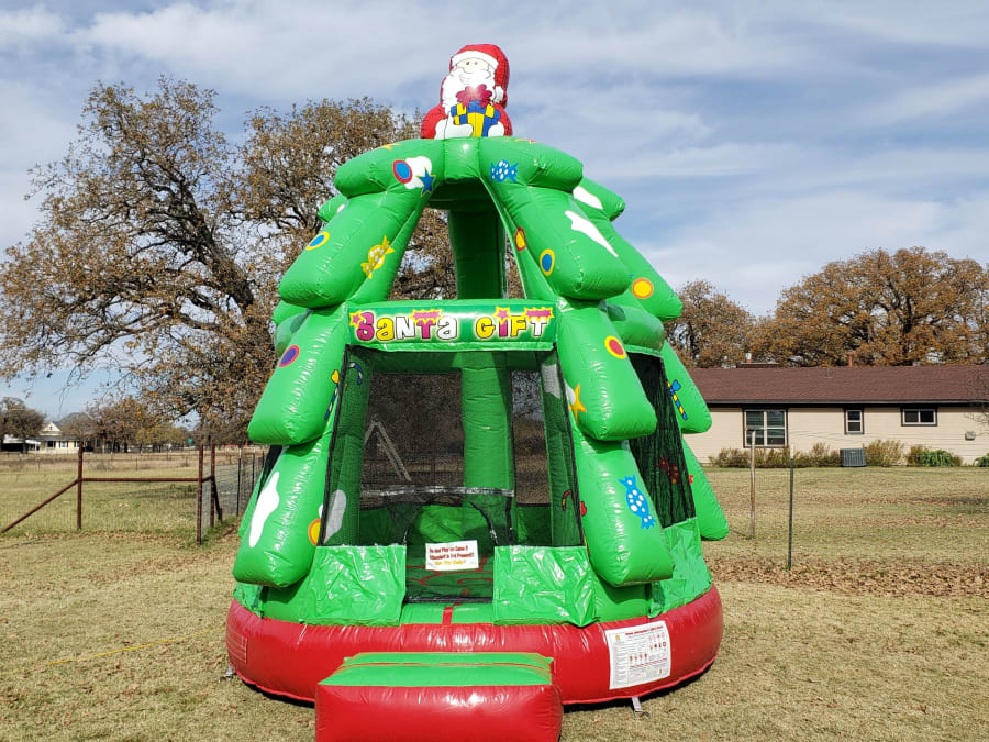 What a way to spend a Christmas party than with our Christmas Tree bounce house. Holiday inspiring graphics cover the bounce house with snow, stars, candy, ornaments and topping it off a big Santa. This will be the centerpiece to any holiday party, church event, holiday organization event and more.