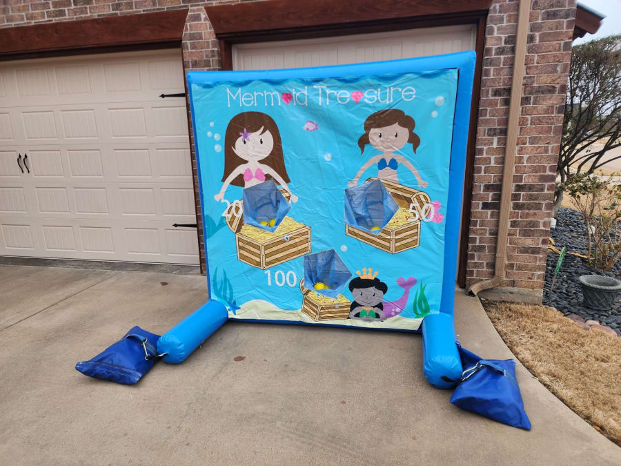 The Mermaid Treasure toss frame game will thrill those sea lovers with a game of chance. Guests toss balls into the Mermaid's treasure chests for point. Wonderful graphics and its compact size make this game popular at parties. This sealed air frame has not blower making it ideal for indoor parties, or even outside. Pair this up with our Mermaid Combo and cotton candy machine for an incredible party!