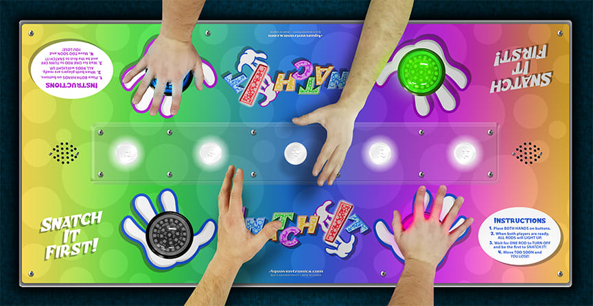 The Snatch-It Game is a lively head-to-head challenge that brings quick reactions, focus and plenty of laughs to any event. Two players face off and watch a row of lights. When the lights switch off, both players try to snatch the centre rod before their opponent does. It is simple to learn and entertaining to play, which makes it a popular choice for groups of all ages.
