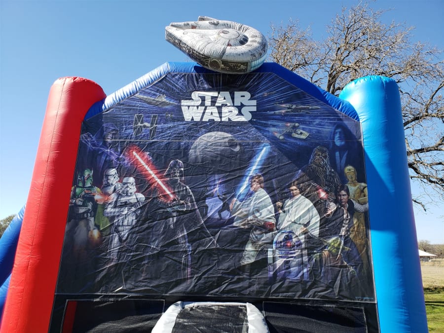 Coming from a galaxy far, far away the Millennium Falcon brings STAR WARS to your party as a bounce and slide bounce house combo. The rebellion and the dark side are right up front greeting kids of all ages to jump, play basketball, leap through the bounce house and slide down the inflatable slide. Jump dry in the cooler months and wet to cool off during the summer.
