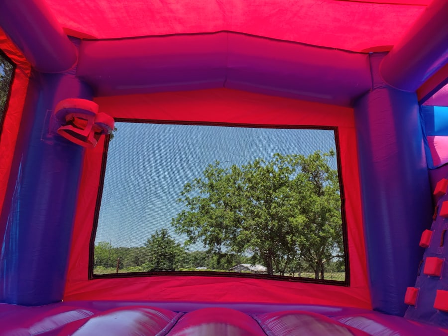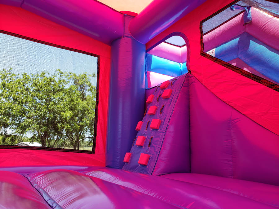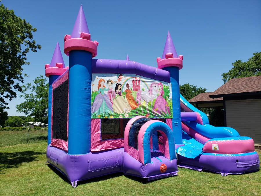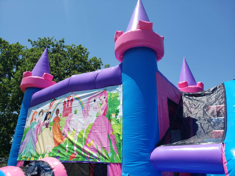 Your little Princess will be overjoyed when she and her friends see the Princess Bounce and Slide Bounce House Combo. Not only an awesome pink, blue and purple colored combo with tall spirals but it has a huge princess banner on the front too! The large bounce house area allows those little darlings enough room to play all day jumping, running, or playing basketball inside. A challenging climb up to a 7' wet or dry slide platform leads to a steep slick slide out. Play in it dry for indoor set-ups or in the cooler months, or add the wet option for an incredible time during the Spring and Summer.