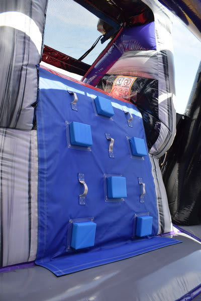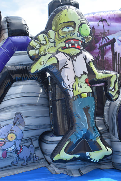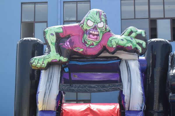 WARNING! The Zombie horde has arrived at your house! Be prepared to have a ton of fun with the Zombie Apocalypse with its huge jump area, basketball goal, climbing wall and slide. The large bounce area allows those little zombie lovers room to play all day, or night jumping, running, or playing basketball inside. A challenging climb up to a 7' slide platform leads to a steep slick slide out. Play in it dry for indoor set-ups or in the cooler months, or add the wet option for an incredible time during the Spring and Summer.