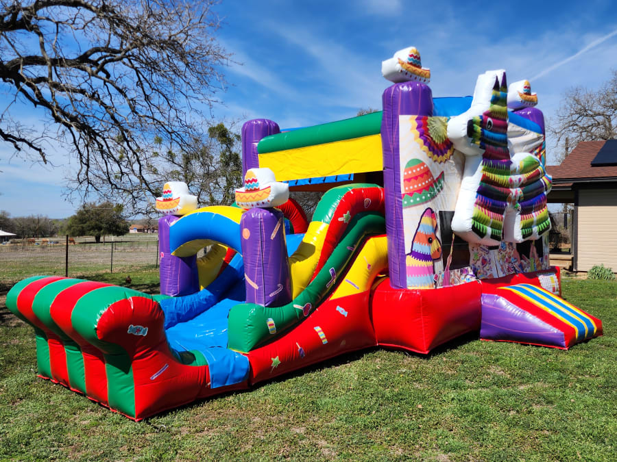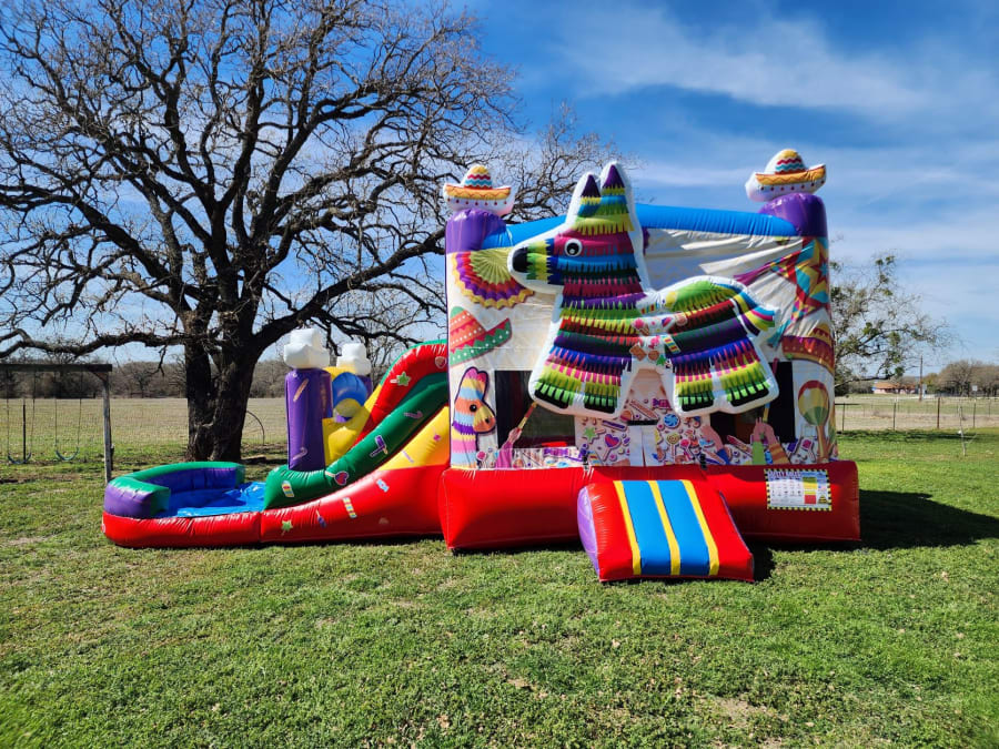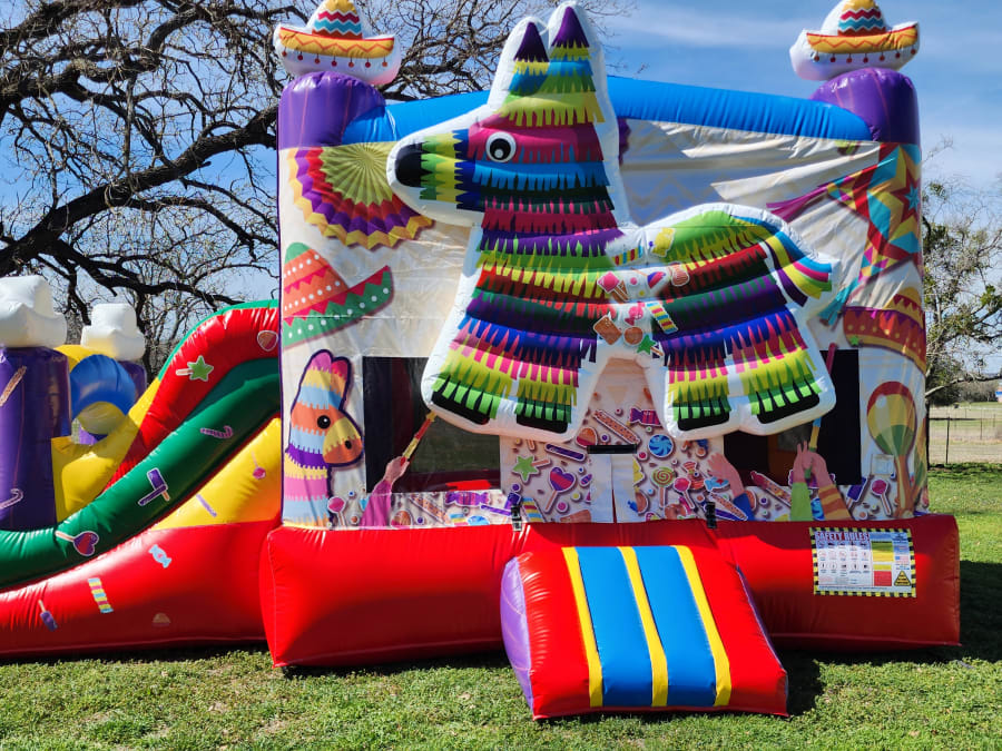 Kids go crazy when the piñata comes out. Something about the thrill of hitting it for the prizes inside. Our Burrow Fiesta combo will provide tons of excitement building up to the real piñata fun. The 3D burrow makes it look huge and inside you'll find a large jump area, basketball goal for hoops and a vertical obstacle for more fun. The graphics depict it being hit with all the candy and prizes falling out over the combo. Vibrant colors and graphic design make this an awesome center piece for any party. Add water in the hot summer for wet fun or use it dry in the cooler months. Either way the Burrow Fiesta is an excellent choice for fun!
