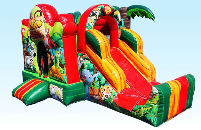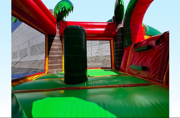 Jungle Time is just the right size for the littles. Incredible colors, animals and MORE inside! The Jungle Time combo is compact in size but packed with a fun bounce area, vertical pop-up, a climb and slide down. It's just like the bigger ones, just a bit smaller! Gorgeous animal graphics cover the outside backed with palm trees making this combo inviting for ages up to six years old.