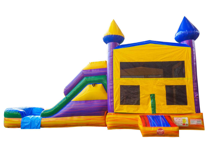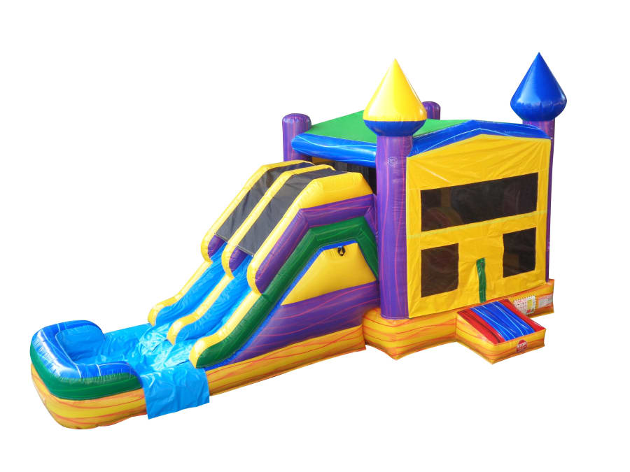 The Mardi Gras Bounce House Combo combines bounce, climb, slide, and splash in one exciting unit.
