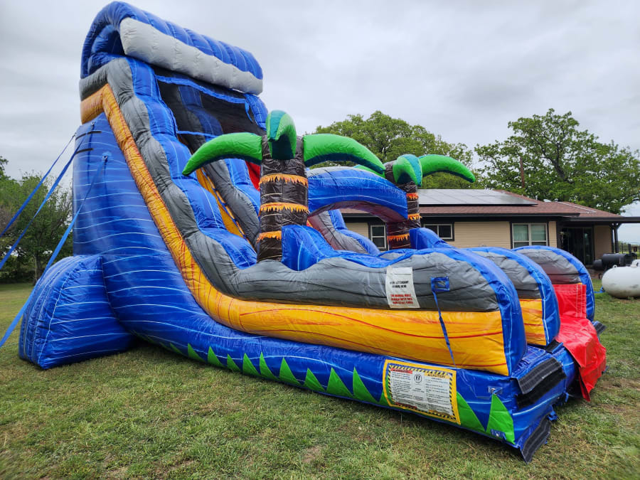 Enjoy the huge tsunami wave rushing down on top of the fire blasting lava lane into a large fresh cool pool. The Tropical Fireblast Tsunami has incredible colors, palm trees, a wave along with an awesome single lane drop. It's big, bold and fun. This would be a fantastic way to spend a warm summer day for any birthday, sport organization party, church event, or just a fun time in the backyard. We'll come out, set everything up while you tend to the things you need to, then return and leave things the way they were when we showed up.