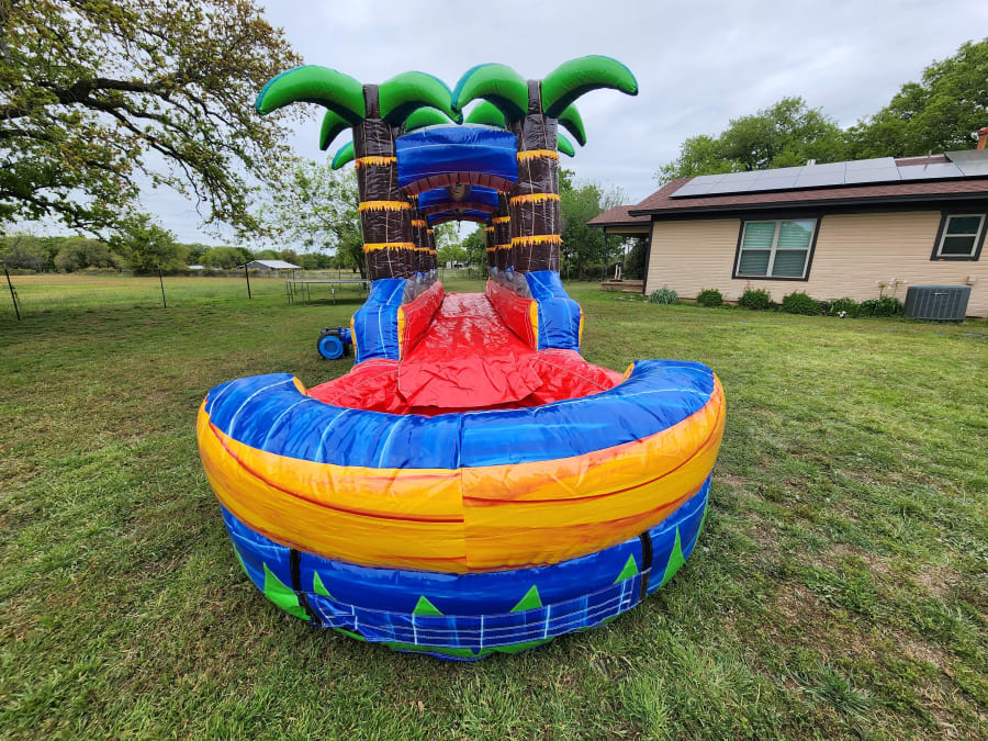 Get crazy wet sliding down our Tropical Fireblast single lane slip and slide. Yeah, it's a big kids version with the inflated old slip and slide. Get drenched with the water spraying all-the-way-down ending with a bigger splash in the pool. It's a blast, it's a tropical firebast of fun!
