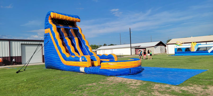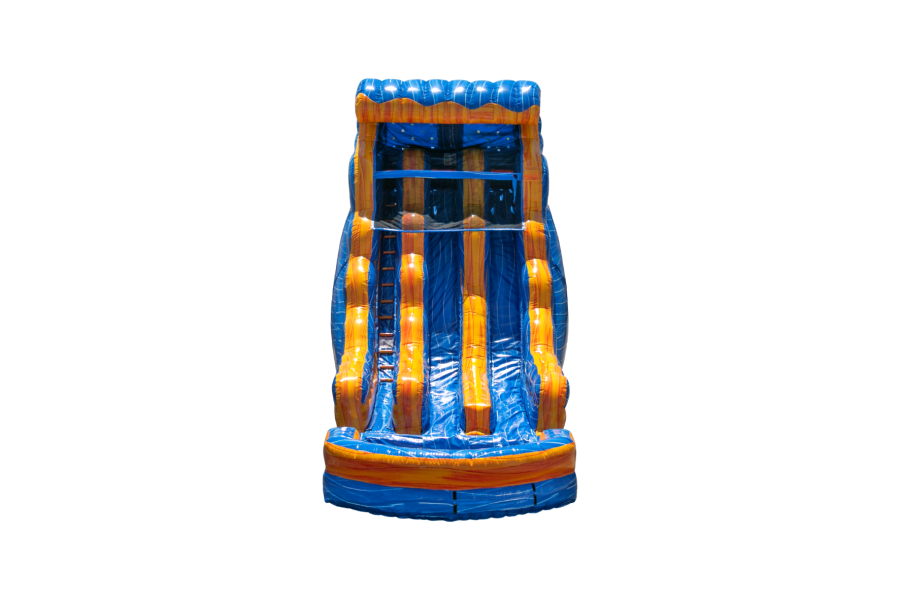Drop straight down an intense slope, side by side with one of your friends or family on the Melting Ice dual lane slide. This blue slide looks like ice causing a tsunami coming down into a wide pool and better yet, feels like it! At 22' tall and dual lane it will keep guests busy climbing up and thrill seeking all the way down. You can't go wrong with this slide for any birthday or general party, school funday or whatever the case. It can be used in the warm days wet and cooler months dry.