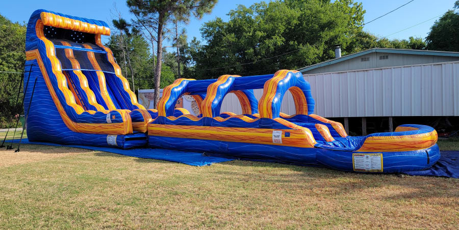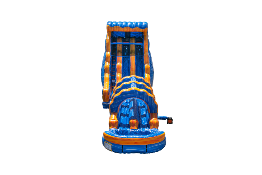 Two down! All the way down 55' of fun! The Melting Ice with Slip and Slide will definitely meet any expectation your guests might have. Climb up the 22' tall slide and race down against family or friend. As if the slide isn't wet enough the slip and slide will put a little more on you as you pass down 28' ending into a large, wide and deep pool. It has bright water like blue and fire like flames colors that will match any party theme. It's good for ages 7 and up too.